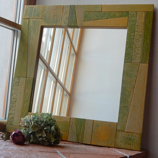 Mozaikové zrcadlo Kukátko do pohádky tvoří kostky z přírodního kamene a probarveného skla.Leštěný povrch dává vyniknout struktuře kamene.Velikost je 25 x 25 cm.